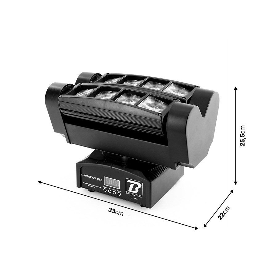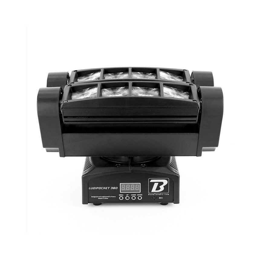 EFFETS LUMINEUX PROFESSIONNELS AVEC UNE ROTATION À 360° POUR VOS ÉVÉNEMENTS.Le BoomTone DJ Ludipocket 360 offre un éclairage multicolore puissant grâce à ses 8 LED CREE RGBW 4-en-1 de 10W, avec rotation indépendante des barres et strobe réglable. Compact et léger, il s’installe facilement et assure des animations lumineuses dynamiques et précises.