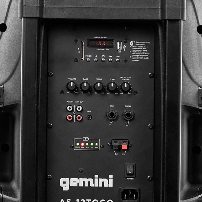 PUISSANCE, CONNECTIVITÉ ET AUTONOMIE DANS UN FORMAT ULTRA-PORTABLE : La Gemini AS-12TOGO délivre jusqu’à 1500 W de son dynamique via Bluetooth, USB, SD ou radio FM.Grâce à sa batterie intégrée et son mixeur audio, elle s’adapte à toutes vos envies musicales. Branchez, diffusez, profitez.