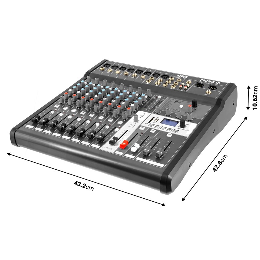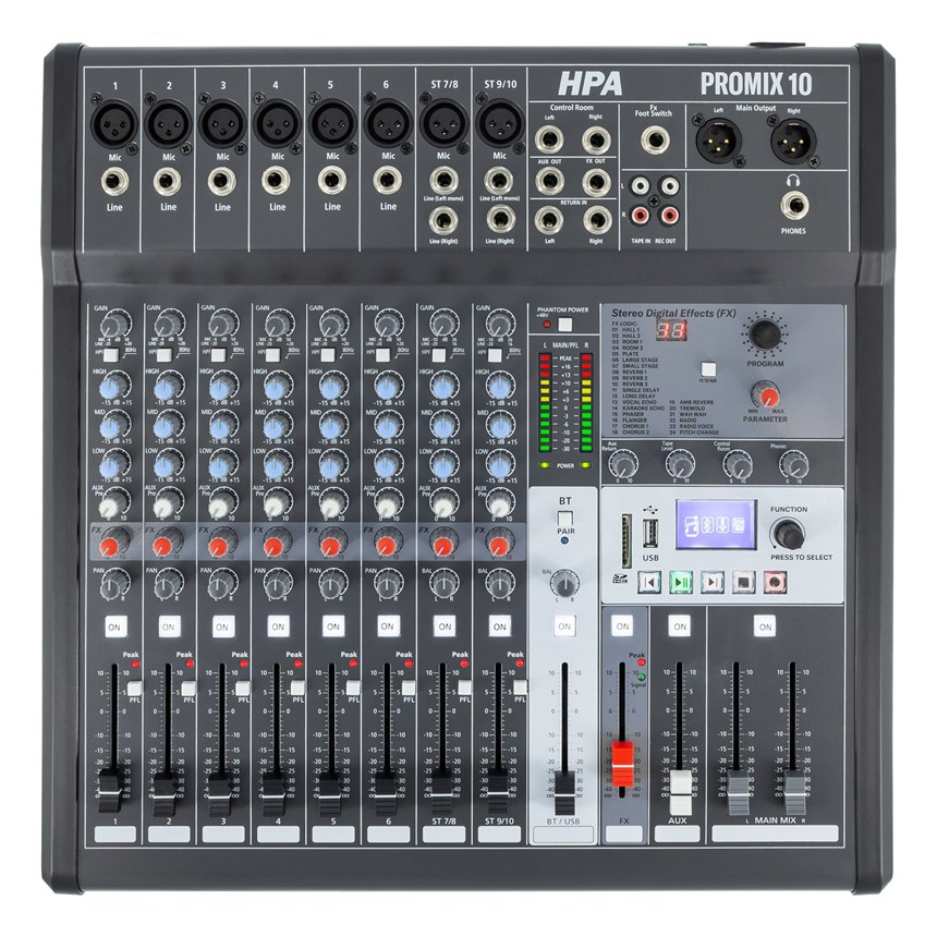 La HPA Promix 10 offre 10 canaux, multi-effets DSP 24 presets, connectivité USB/Bluetooth/SD et alimentation fantôme +48V.Égaliseur 3 bandes, 8 faders linéaires et entrées MIC/ligne assurent un mixage clair et précis, du live au studio.