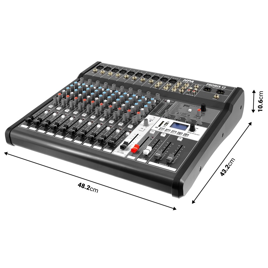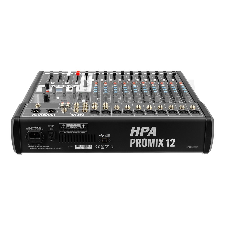 HPA PROMIX 12 : LA CONSOLE ANALOGIQUE ULTIME POUR VOTRE SONORISATION ! Profitez de 12 canaux, DSP intégré avec 24 effets réglables et connectivité USB 2.0 pour un enregistrement direct. Son égaliseur 3 bandes, alimentation fantôme +48 V et lecture MP3 Bluetooth assurent une polyvalence maximale. Adaptez-la facilement en rack 19" (option). Passez à la qualité professionnelle dès aujourd’hui !