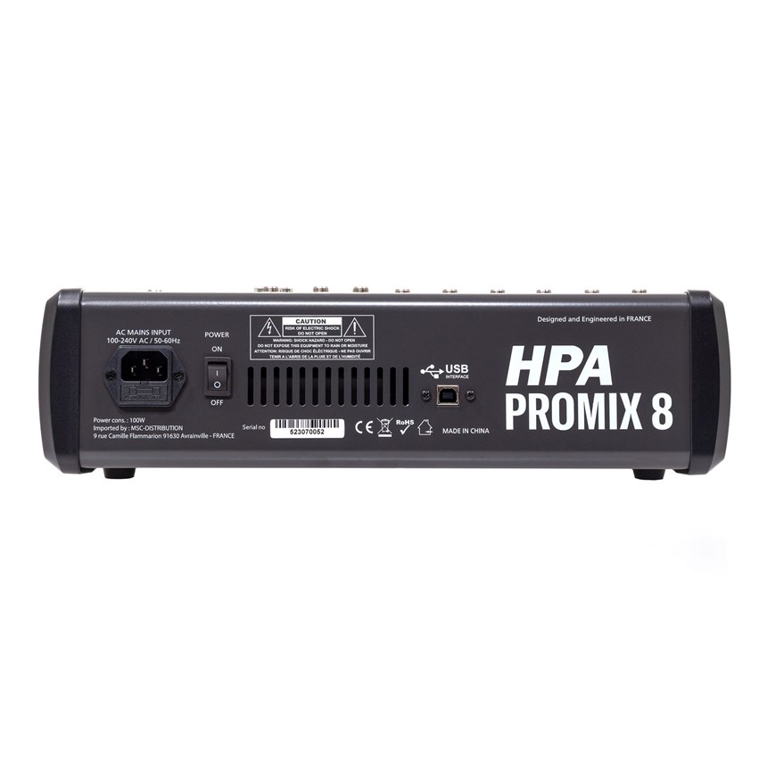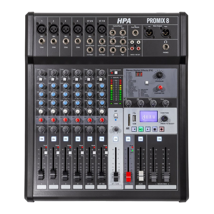 ÉLEVEZ VOTRE SON AVEC LA HPA PROMIX 8 ! Console analogique 8 canaux avec multi-effets, micros XLR +48 V, entrées ligne et stéréo, égaliseur 3 bandes et 6 faders linéaires pour un mix précis et flexible.Lecture/record MP3 via USB, Bluetooth ou SD. Adaptable en rack 19" et parfaite pour live, podcast et studio. Commandez maintenant et libérez votre créativité sonore !