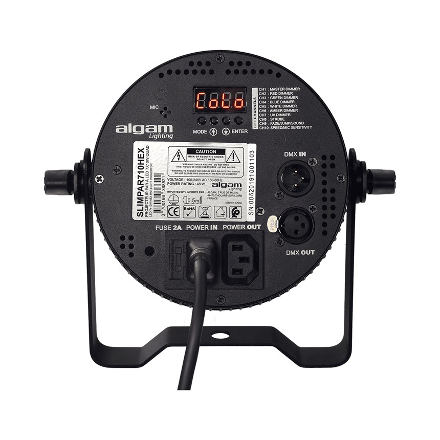 POWERFUL AND VERSATILE LED PAR PROJECTOR.Designed to illuminate your indoor events and stages, this LED PAR projector features seven 10W RGBW + amber + UV LEDs offering a wide 60° beam angle for optimal diffusion. Thanks to its Auto, Music-Activated, Master/Slave, and DMX modes, it adapts to all uses, from DJ shows to stage performances. Its passive cooling ensures silent operation, while its robust aluminum chassis, dual rigging bracket, and IR remote control make it a complete and easy-to-install tool.