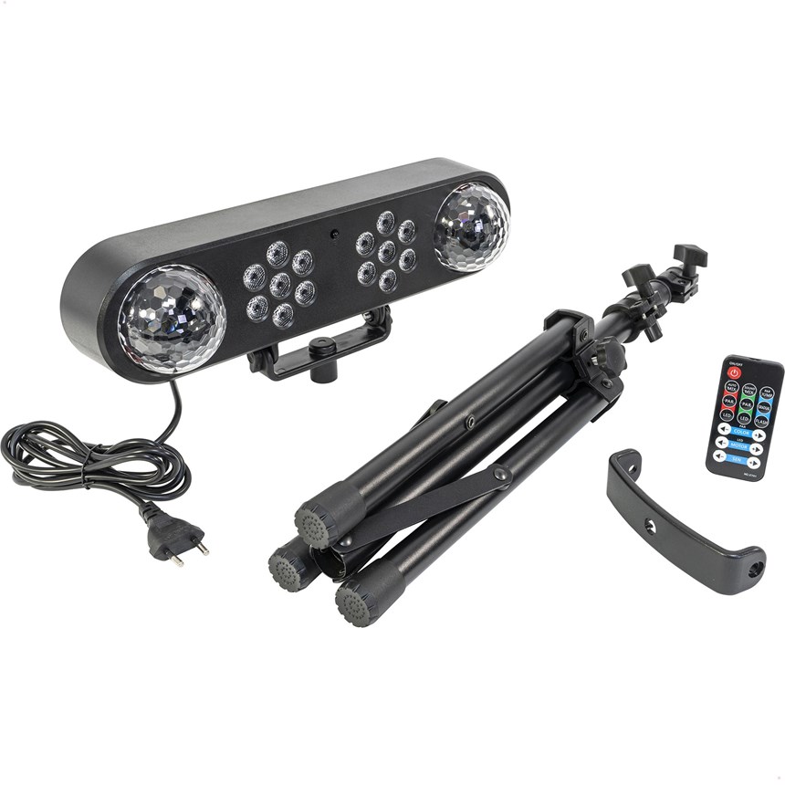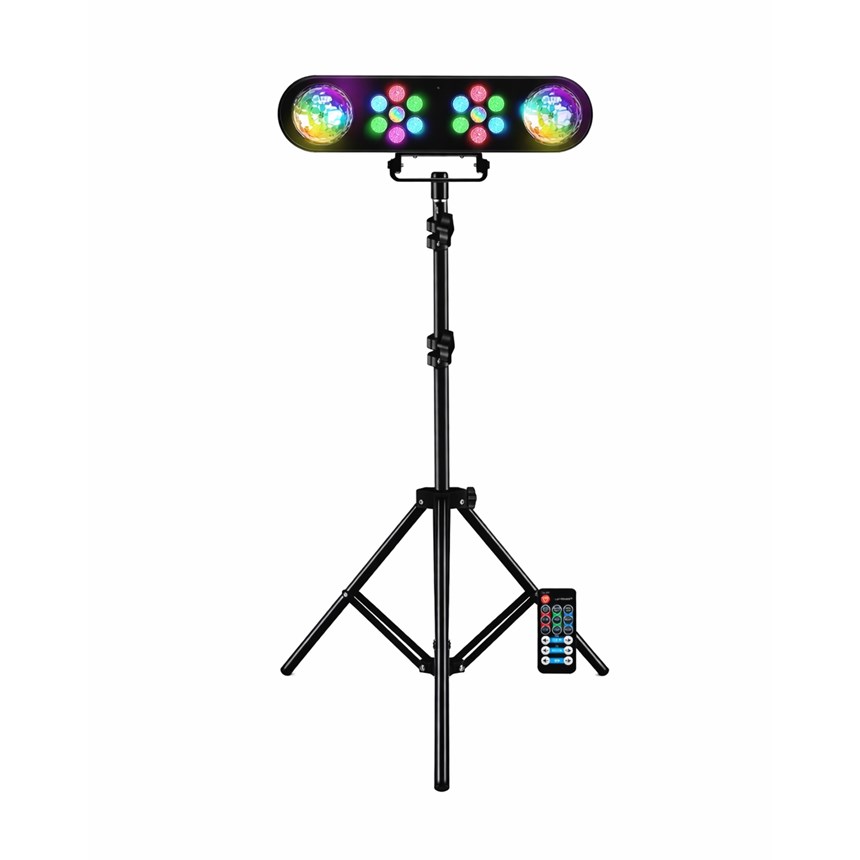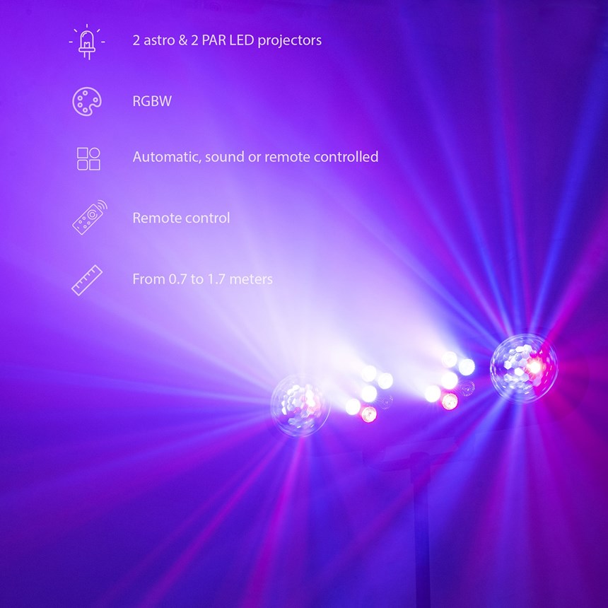 TRANSFORMEZ VOS SOIRÉES EN VRAI SHOW LUMIÈRE ! Ce pack complet 4 effets LED offre une couverture puissante avec projecteurs multicolores et effets Astro Ball pour des faisceaux dynamiques.Modes automatique ou musical pour une ambiance instantanée sans réglage complexe. Livré avec pied jusqu’à 1,70 m et télécommande pour un contrôle facile. Idéal soirées, anniversaires et salles des fêtes. Créez un spectacle impressionnant dès maintenant !