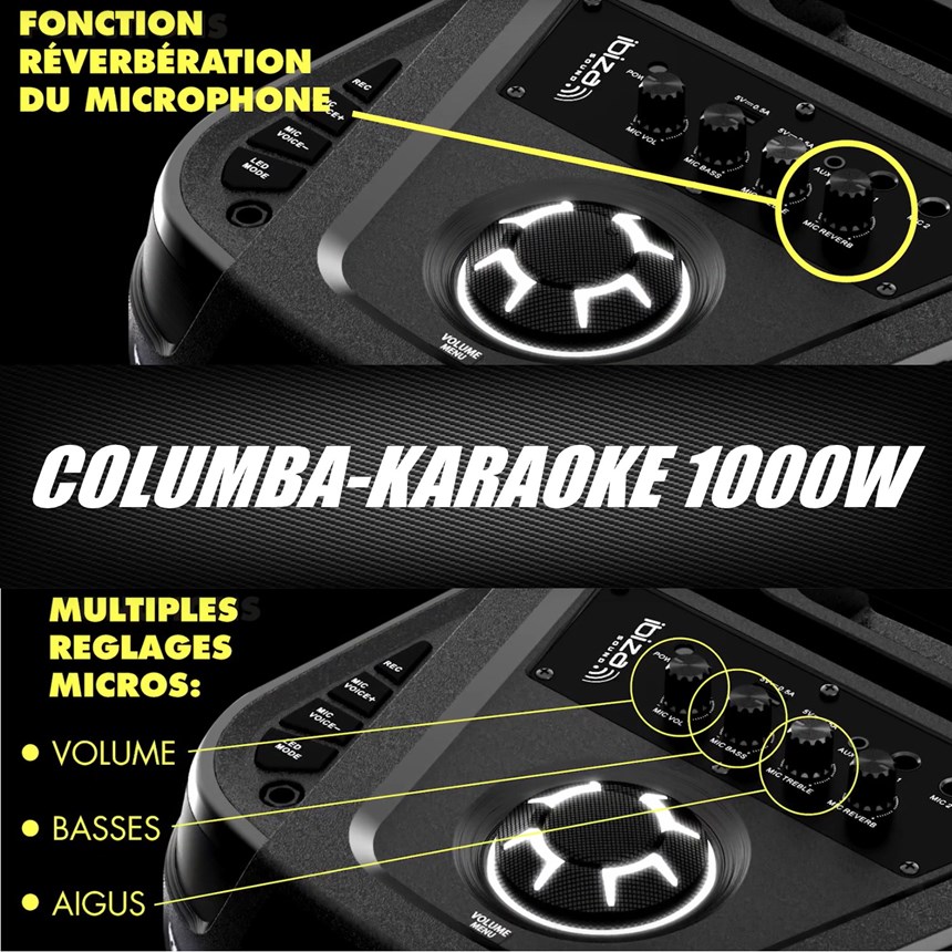 - ✔️ Enceinte COLUMBA-KARAOKE d'une puissance de 1000W avec 2 boomers 10” et effets lumineux LED pour un show musical époustouflant !