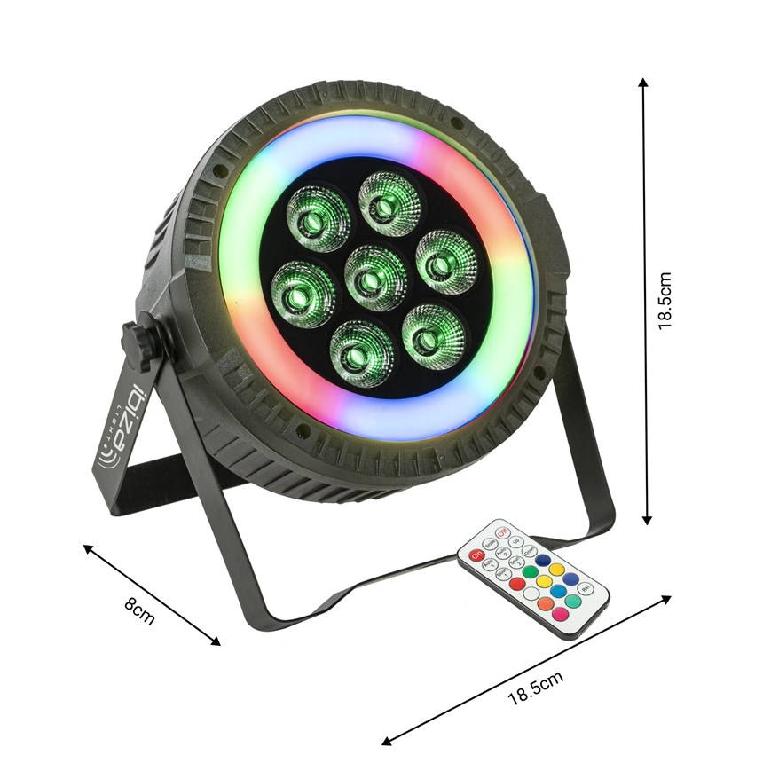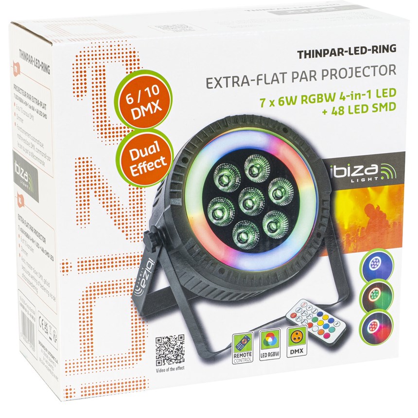 EFFETS LUMINEUX COMPACTS ET PUISSANTS ! Le THINPAR-LED-RING combine 7 LED RGBW 4-en-1 de 6 W et 48 LED SMD pour un rendu lumineux éclatant.Contrôle via DMX 6/10 canaux, automatique, maître-esclave, son ou télécommande. Compact et extra-plat, il se pose au sol, au mur ou sur structure pour vos événements et shows.