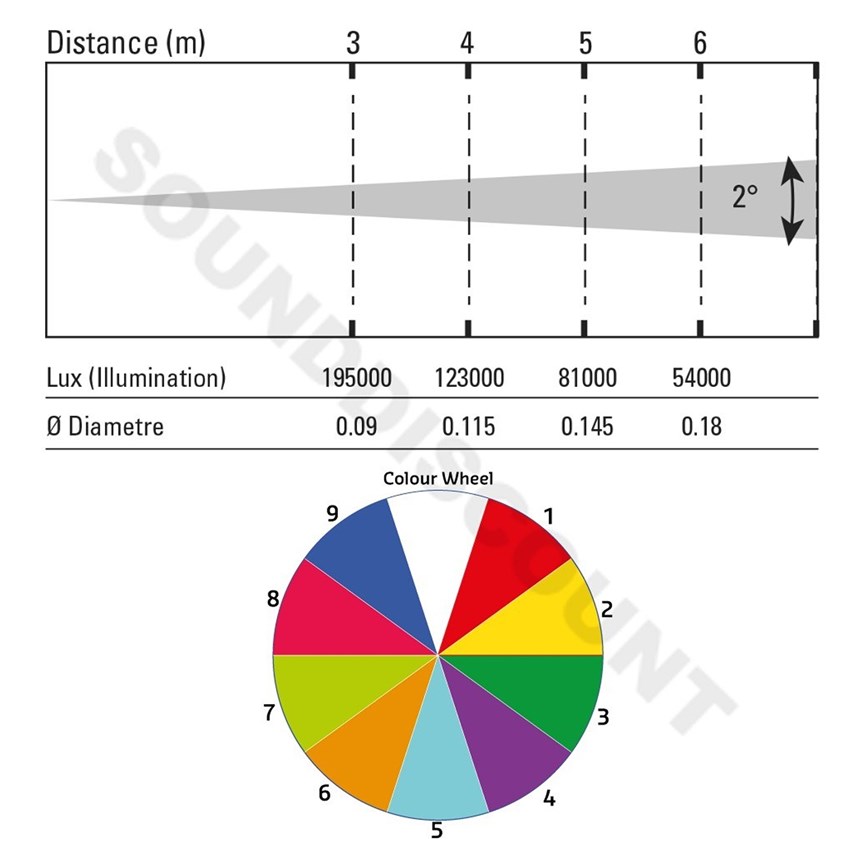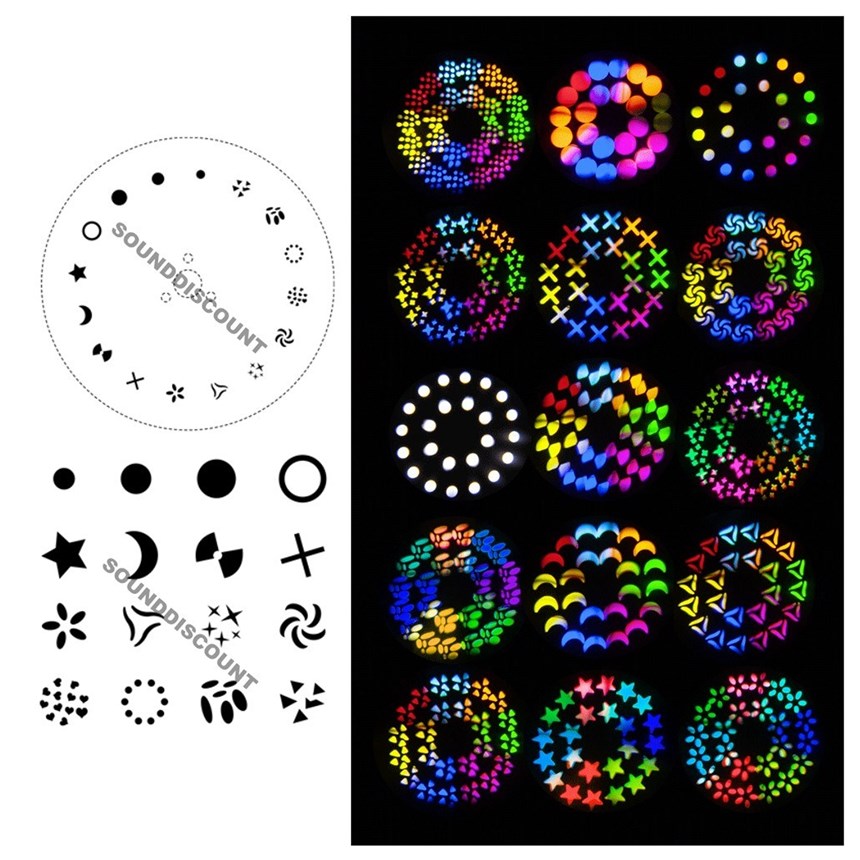 - ROUES COULEURS & GOBOS : 9 couleurs + blanc, 16 gobos fixes avec effet shake et Rainbow.