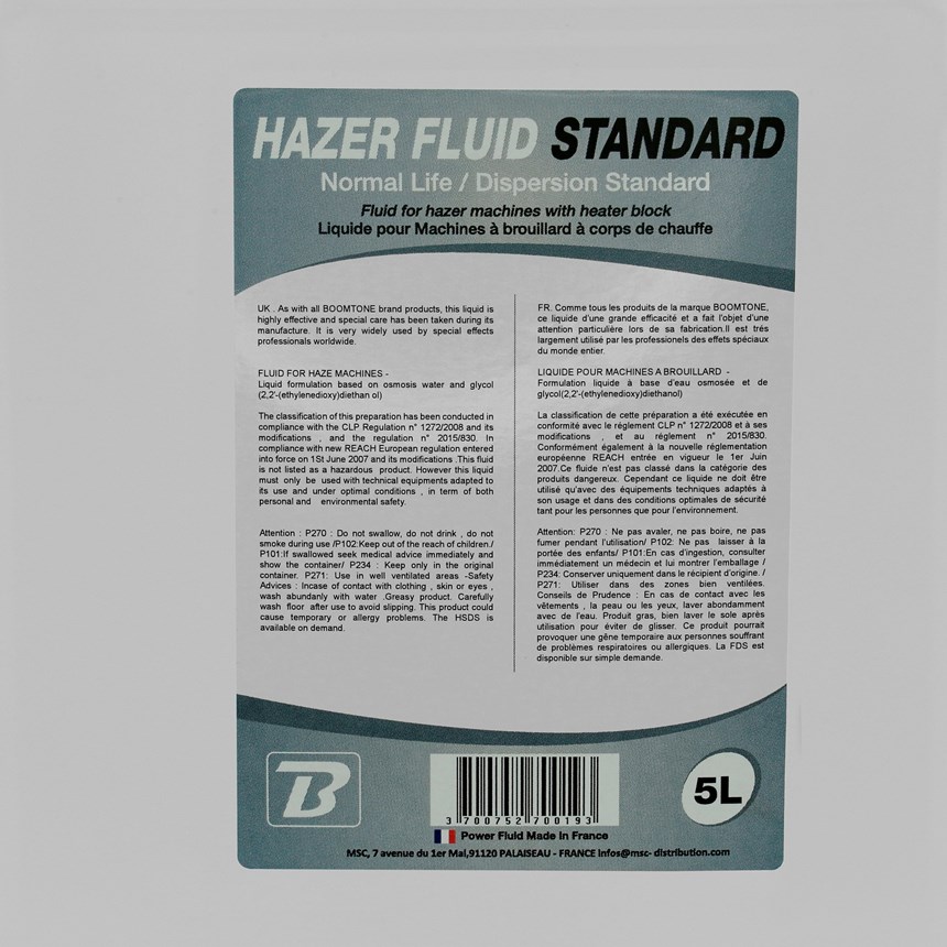 CRÉEZ UNE AMBIANCE INOUBLIABLE AVEC UN BROUILLARD BLANC D’EXCEPTION.Le liquide BoomTone DJ Hazer Fluid Standard 5L offre une dispersion lente pour un brouillard clair et dense qui sublime vos jeux de lumières. Conforme aux normes NF et CE, ce liquide concentré à base d’eau garantit sécurité et performance. Optez pour une atmosphère professionnelle et maîtrisée. Commandez dès maintenant !