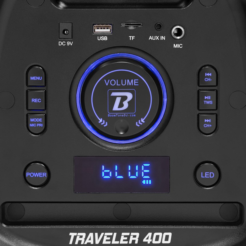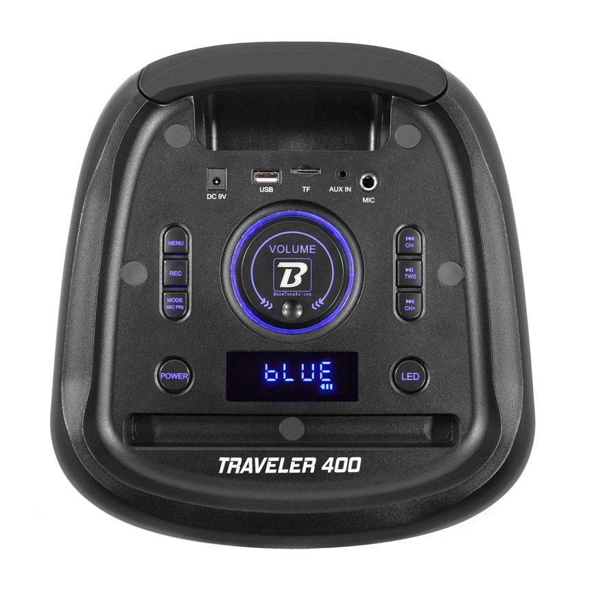 SON PUISSANT ET MOBILITÉ TOTALE.La BoomTone DJ Traveler 400 délivre 400 W de puissance grâce à ses doubles boomers 8" et son tweeter 1", pour un son clair de 55 Hz à 20 kHz. Avec Bluetooth 5.0 TWS, USB/SD, entrée micro et effets lumineux, elle anime vos soirées partout. Batterie 2–4 h, trolley et légèreté pour un transport facile. Emportez la fête où vous voulez.