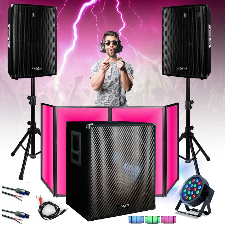 Le pack inclut une sono complète "prête-à-brancher" composée de 2 enceintes de 700W, un caisson de basse de 800W, 2 pieds d'enceintes et un projecteur PAR LEDS RGB !